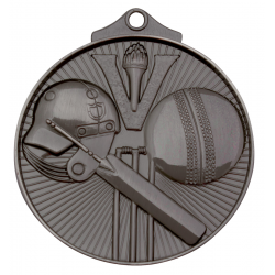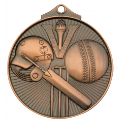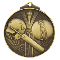 Antique gold, silver and bronze medals for Cricket. A classic design, the Sunraysia Medals feature classic elements ? helmet, wickets, bat and ball. Medals feature an extra thick edge and a rectangle panel on the back of the medal for your engraving. Colours available - Gold, Silver, Bronze - Price Excludes Ribbon