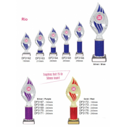 Rio series of trophies feature attractive pattern and available in different colour combinations. Brilliant option to showcase a custom logo or design. Colours available - Gold/Red, Silver/Blue, Silver/Purple. Available in 5 sizes