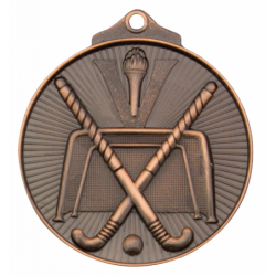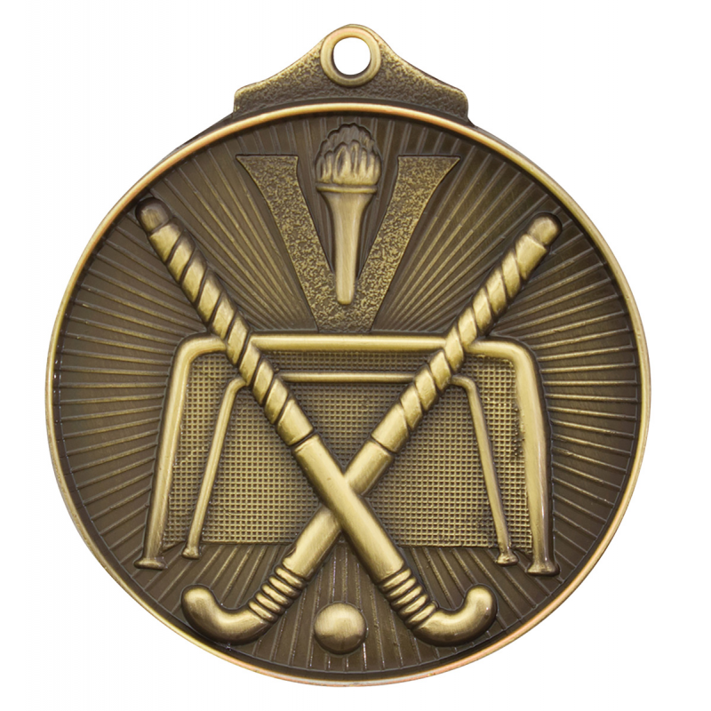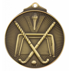 Antique gold, silver and bronze medals for Hockey. A classic design, the Sunraysia Medals feature classic elements of the crossed hockey sticks against the goal background. Medals feature an extra thick edge and a rectangle panel on the back of the medal for your engraving. Colours available - Gold, Silver, Bronze - Price Excludes Ribbon