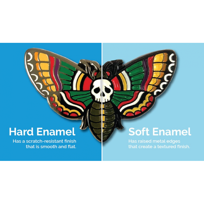Soft enamel pins have a slightly raised metal outline and recessed areas filled with enamel paint, creating a textured, dimensional look.
