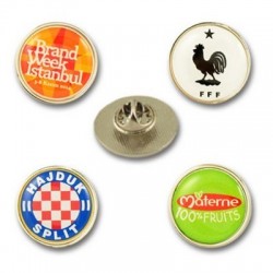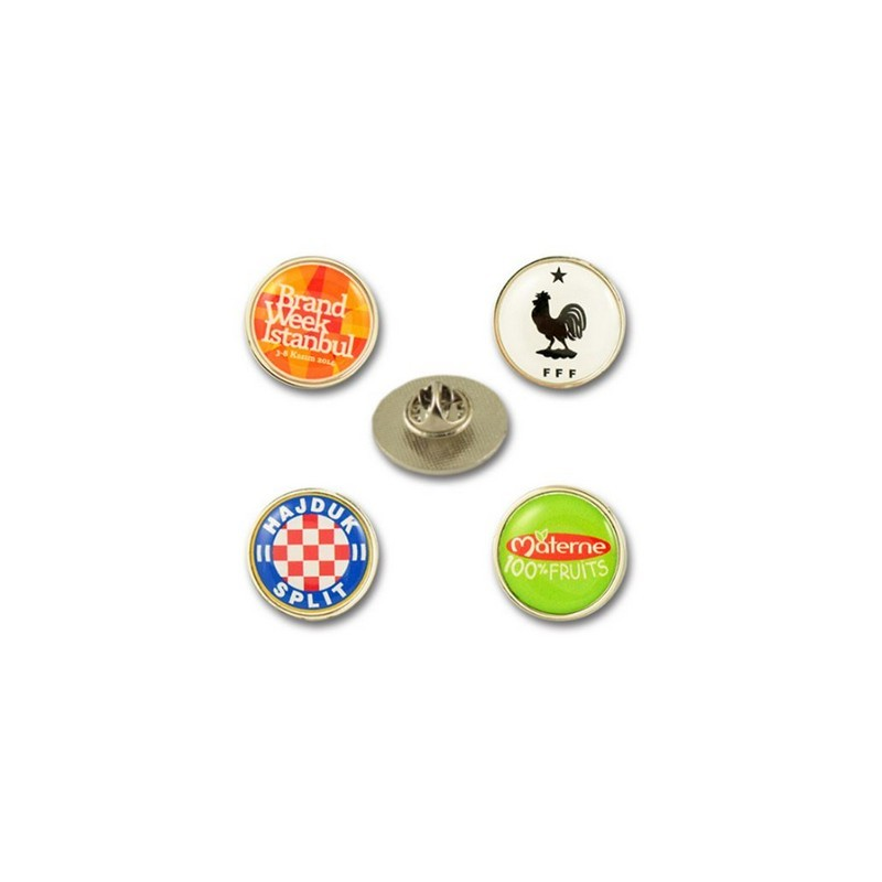 Round metal lapel pins with doming Doming will magnify your logo and guarantees logo's long life in outdoor conditions