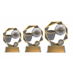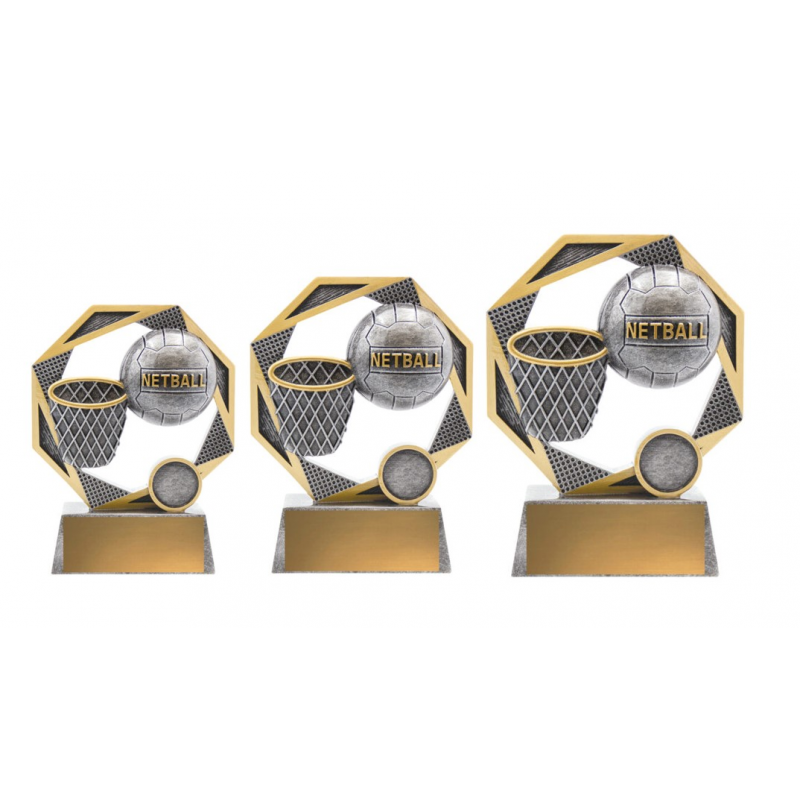 Elegant design of participation trophies for Netball feature iconic ball & net elements and finished in classic antique silver. Available in 3 sizes