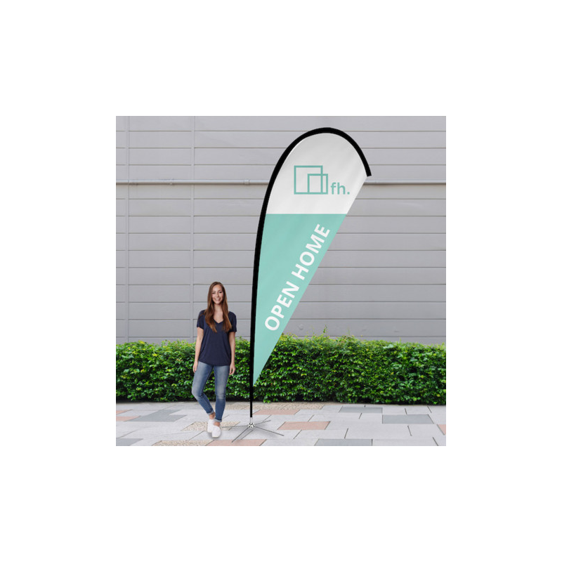 Draw attention to your event or business with an eye-catching tear drop flag. The kit includes a high-quality knitted polyester tear dop flag that measures 303cm x 70cm, and a carry bag. Depending on your needs, you can choose from spike, cross, square, wheel, wall mounted or floor mounted bases. A water bag weight is also available as an additional accessory. This product is branded via sublimation print and has a lead time of 14 working days. Colours: White Dimension: H 3030mm x W 760mm Print Description: Flag side 1 - Please refer to template | Pocket Label - 1350mm x 550mm Print Type: Sublimation Print. Packing: Individual Carry Bag Less than minimum quantities are not available for this item. Please note price breaks apply per colour and/or artwork design.