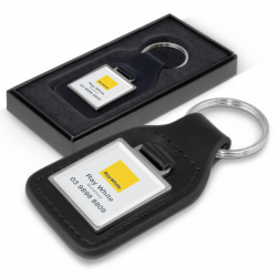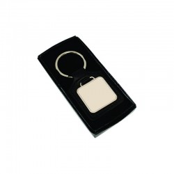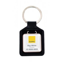Genuine leather key ring with a square metal plate for branding in full colour with a resin coated finish.