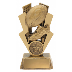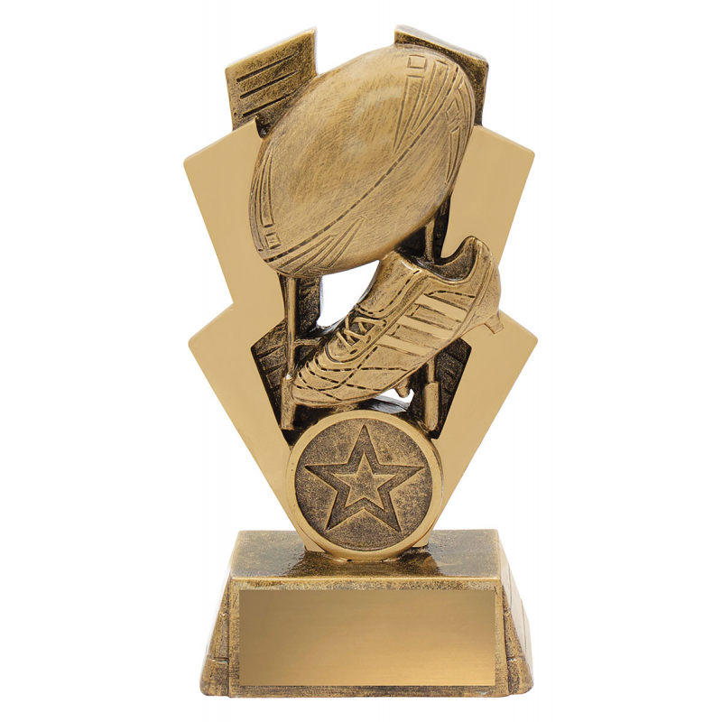 Brilliant series of gold trophies for Rugby with lightning bolt features and elements for your sport. Central space for logo. Gold Resin. Available in 3 sizes
