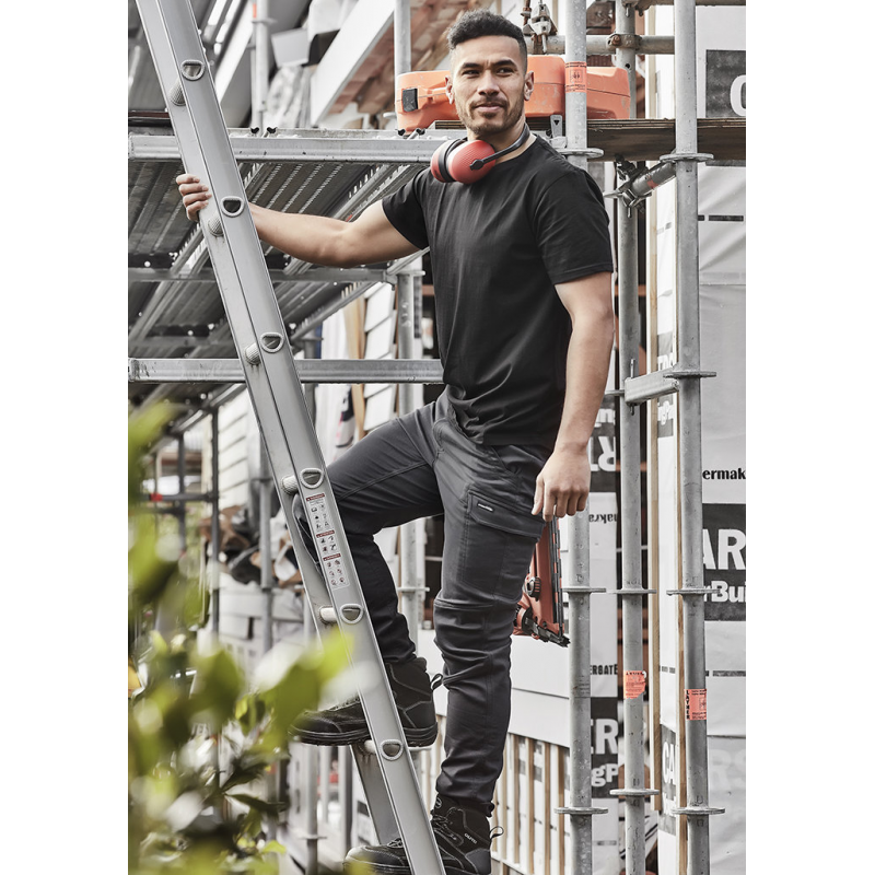 Fabric: 67% Cotton, 31% Polyester, 2% Spandex, 280 GSM Description: Hidden French terry lining gives the comfort of your favourite track pant with the durability needed for the worksite. Stretch fabric and waistband for comfort and freedom of movement at work. Double layer knee. Diamond shaped crotch panel for increased durability. 1 Large cargo pocket. 1 Mobile phone pocket with flap closure. 1 Ruler pocket and pen partition. 2 Back hip pockets. 2 Side waist pockets with wide openings. Modern Fit Sizes: 72R - 132R Colours: Black,Navy, Charcoal, Khaki Print Type: Embroidery / Screen Printing / DTF. Packing: Loose packed Prices Exclude Decoration.